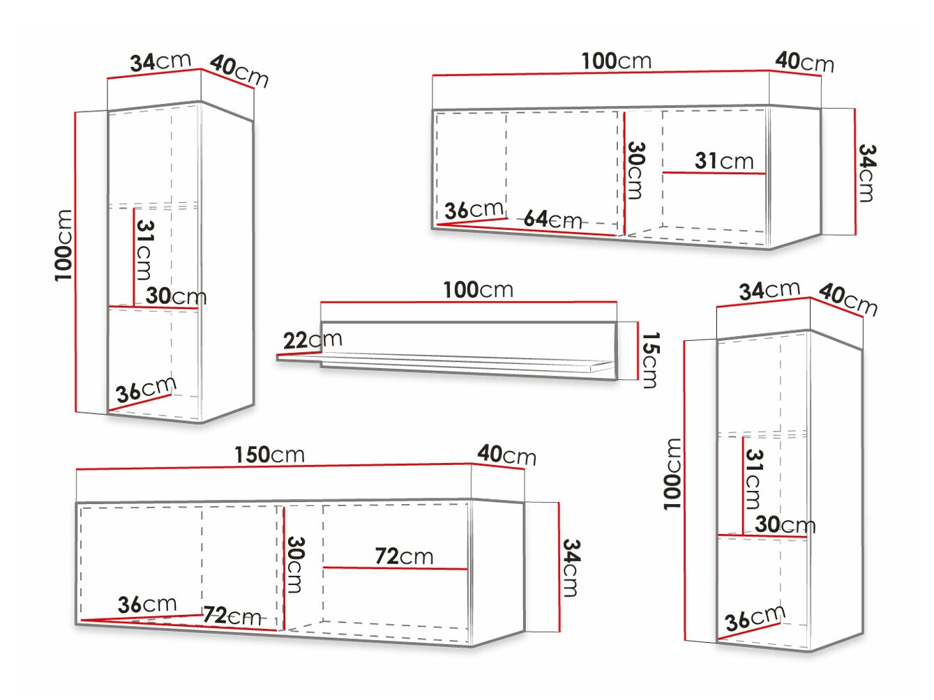 34 x 100 x 40; 34 x 150 x 40 cm