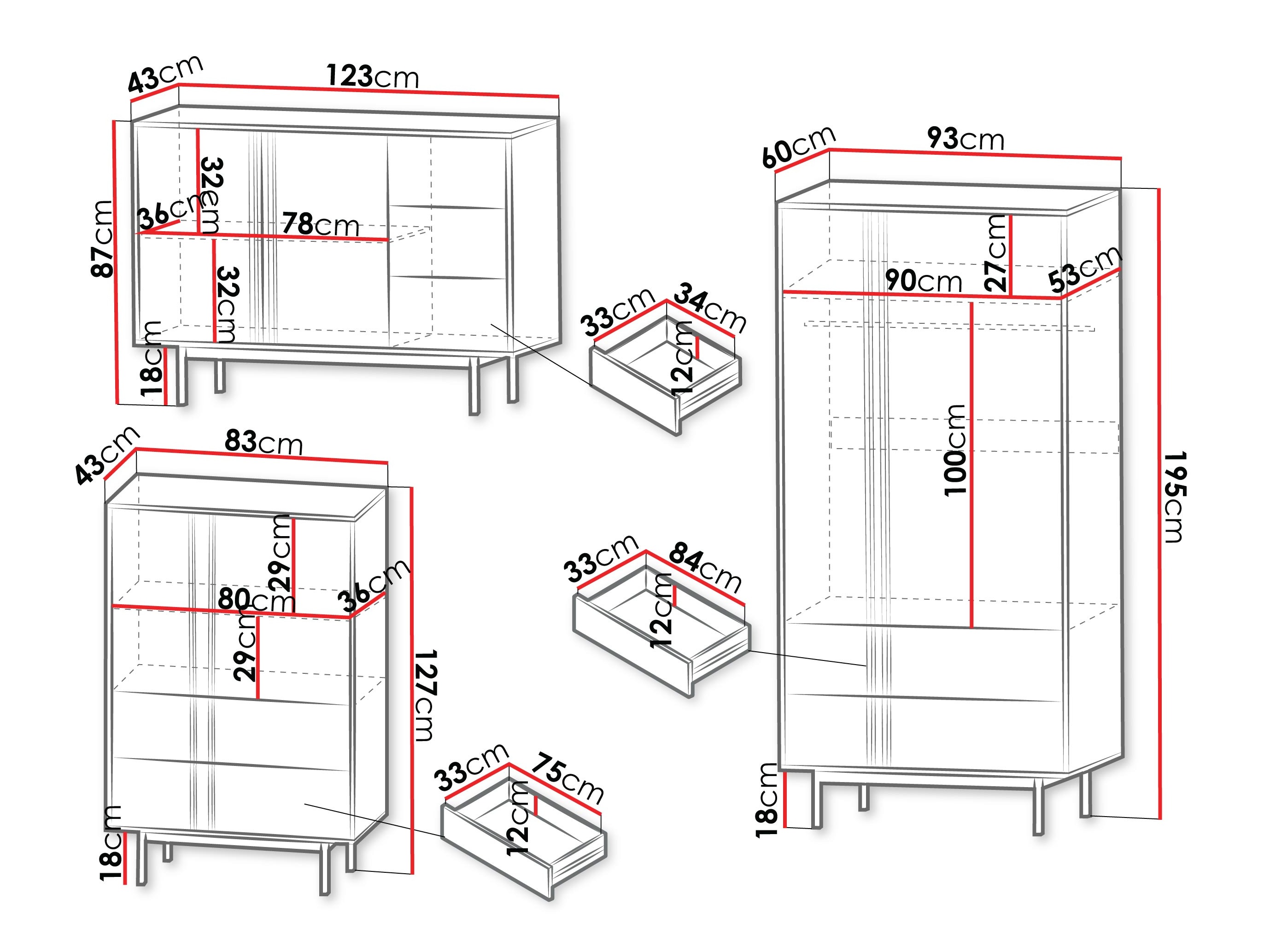 87 x 123 x 43; 127 x 83 x 43 cm