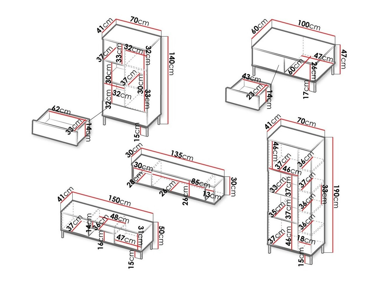 140 x 70 x 41; 190 x 70 x 41 cm